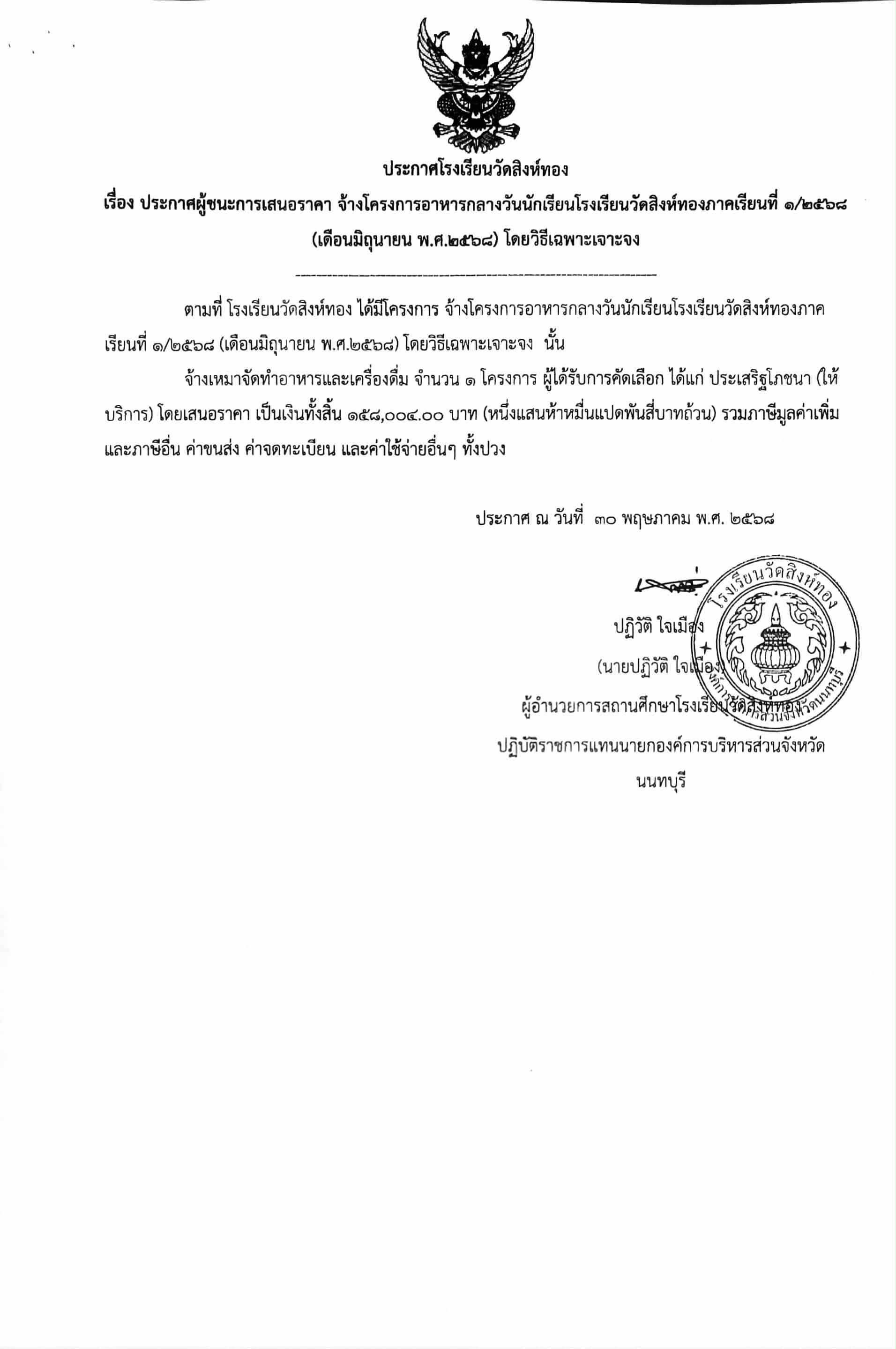 ประกาศผู้ชนะการเสนอราคา จ้างโครงการอาหารกลางวันนักเรียนโรงเรียนวัดสิงห์ทองภาคเรียนที่ ๑/๒๕๖๘ (เดือนมิถุนายน พ.ศ.๒๕๖๘) โดยวิธีเฉพาะเจาะจง