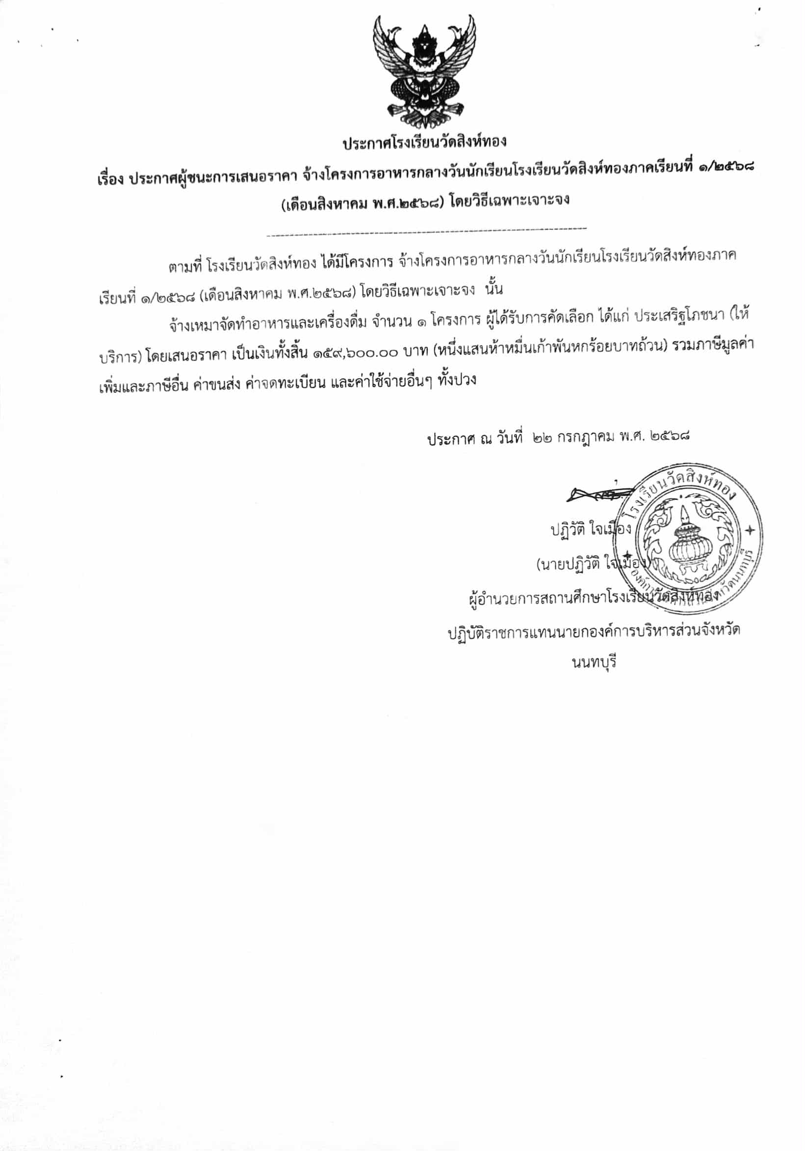 ประกาศผู้ชนะการเสนอราคา จ้างโครงการอาหารกลางวันนักเรียนโรงเรียนวัดสิงห์ทองภาคเรียนที่ ๑/๒๕๖๘ (เดือนสิงหาคม พ.ศ.๒๕๖๘) โดยวิธีเฉพาะเจาะจง