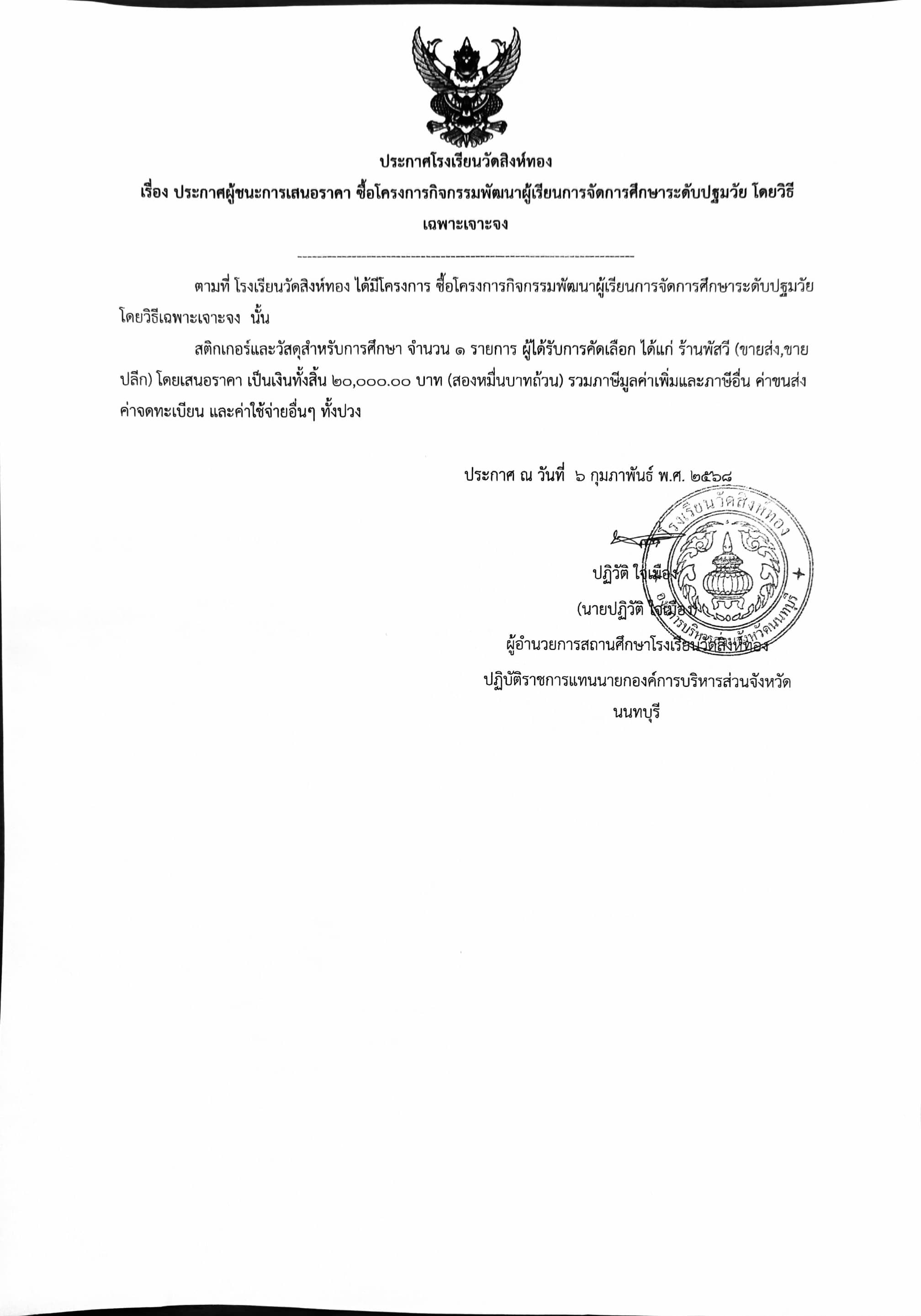 ประกาศผู้ชนะการเสนอราคา ซื้อโครงการกิจกรรมพัฒนาผู้เรียนการจัดการศึกษาระดับปฐมวัย โดยวิธีเฉพาะเจาะจง