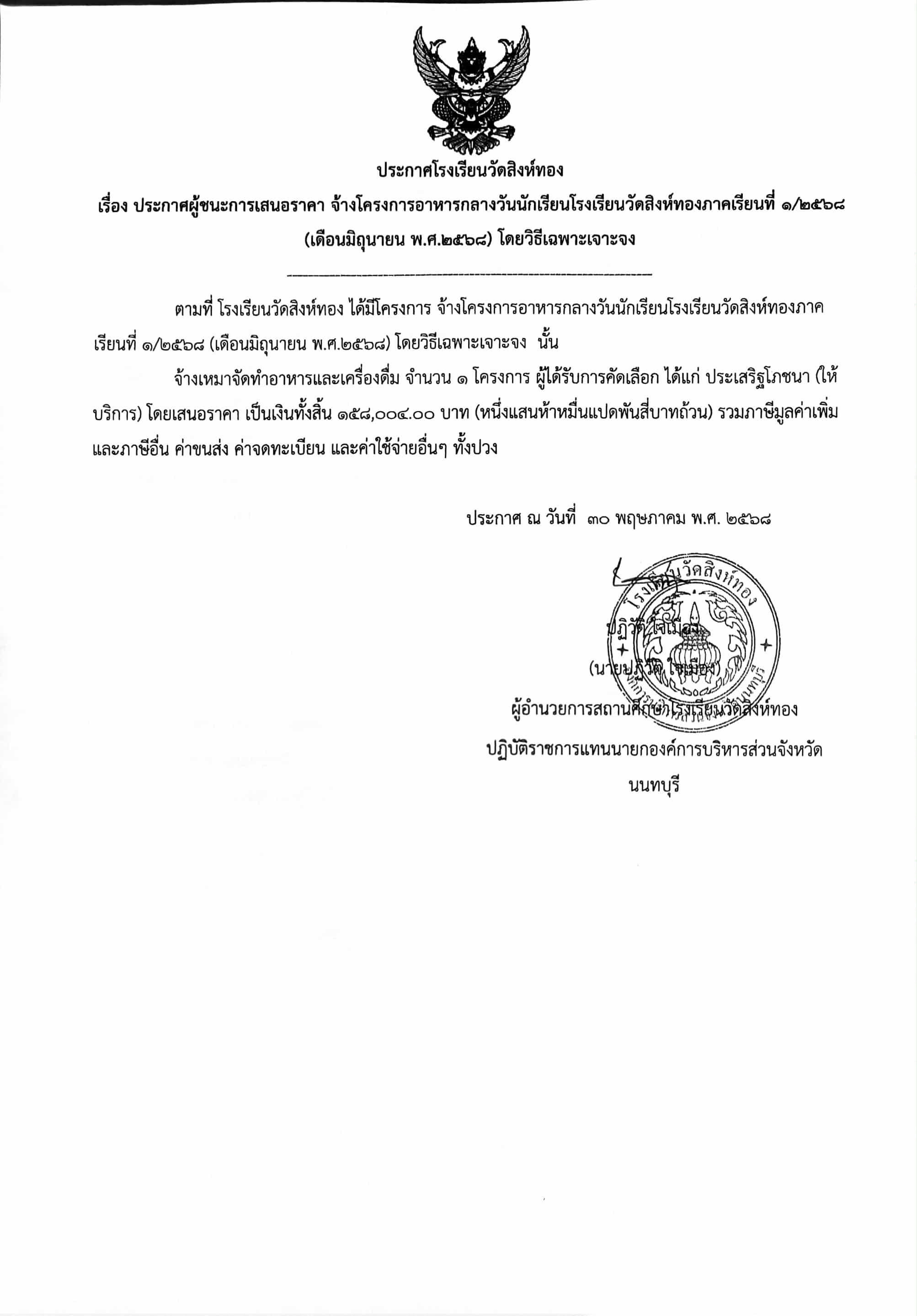 ประกาศผู้ชนะการเสนอราคา จ้างโครงการอาหารกลางวันนักเรียนโรงเรียนวัดสิงห์ทองภาคเรียนที่ ๑/๒๕๖๘ (เดือนมิถุนายน พ.ศ.๒๕๖๘) โดยวิธีเฉพาะเจาะจง
