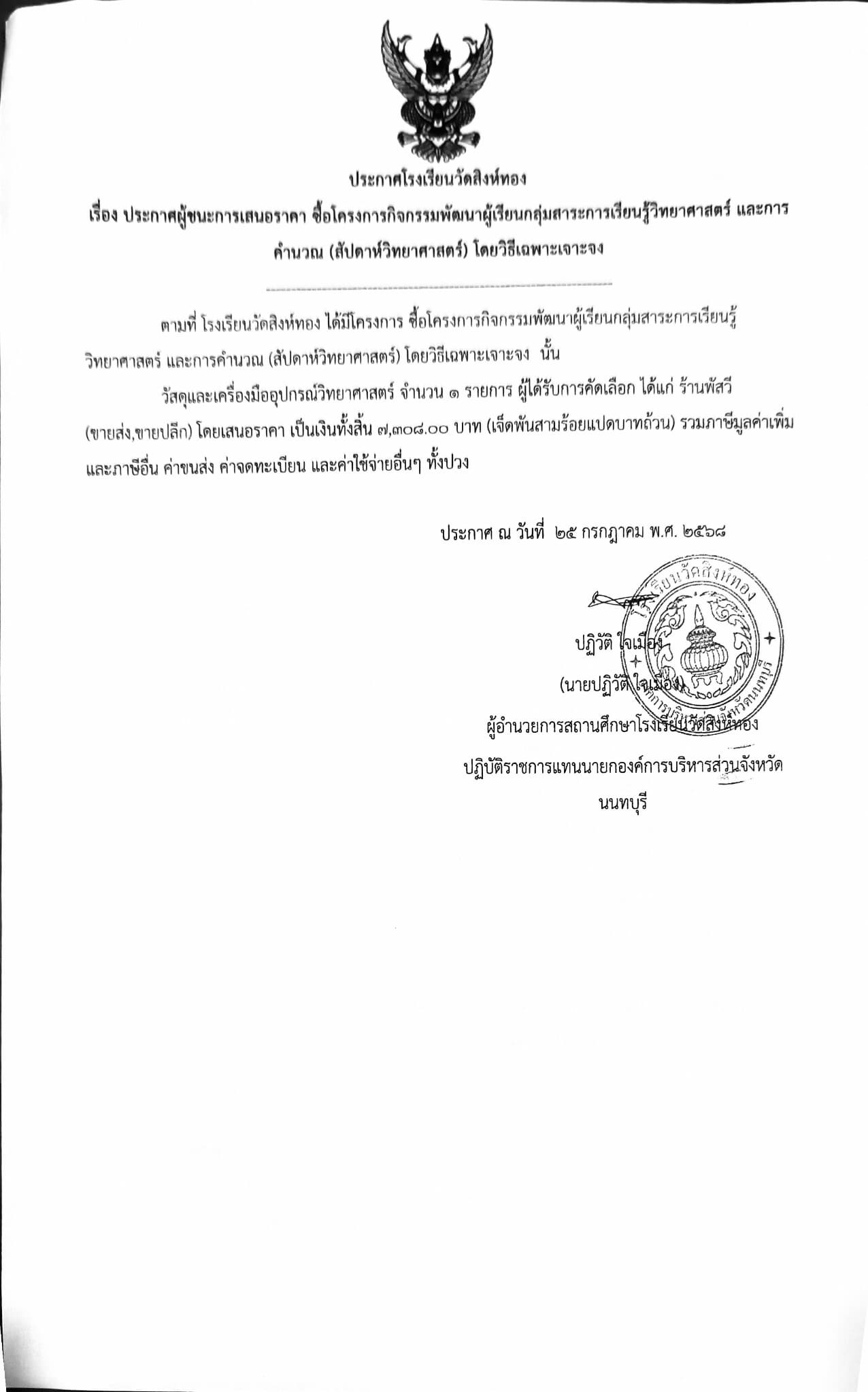 ประกาศผู้ชนะการเสนอราคา ซื้อโครงการกิจกรรมพัฒนาผู้เรียนกลุ่มสาระการเรียนรู้วิทยาศาสตร์ และการคำนวณ (สัปดาห์วิทยาศาสตร์) โดยวิธีเฉพาะเจาะจง