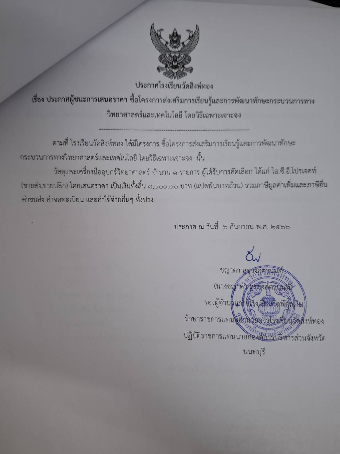 ประกาศเผยแพร่สาระสำคัญในสัญญา (ใบสั่งซื้อ) เลขที่ 27/2566 ลงวันที่ 7 กันยายน 2566 จัดซื้อวัสดุการเรียนการสอน ตามโครงการการส่งเสริมการเรียนรู้ และการพัฒนาทักษะกระบวนการทางวิทยาศาสตร์ และเทคโนโลยี