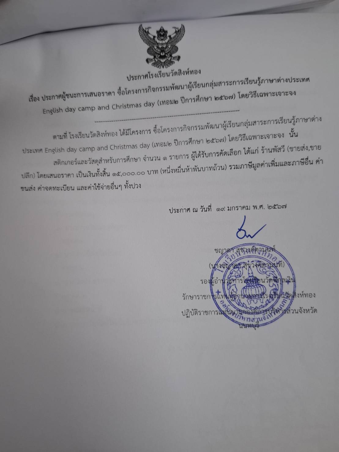 ประกาศเผยแพร่สาระสำคัญในสัญญา (ใบสั่งซื้อ) เลขที่ 5/2567 ลงวันที่ 23 มกราคม 2567 จัดซื้อวัสดุการเรียนการสอน ตามโครงการกิจกรรมพัฒนาผู้เรียนกลุ่มสาระการเรียนรู้ภาษาต่างประเทศ English day camp and Christmas day