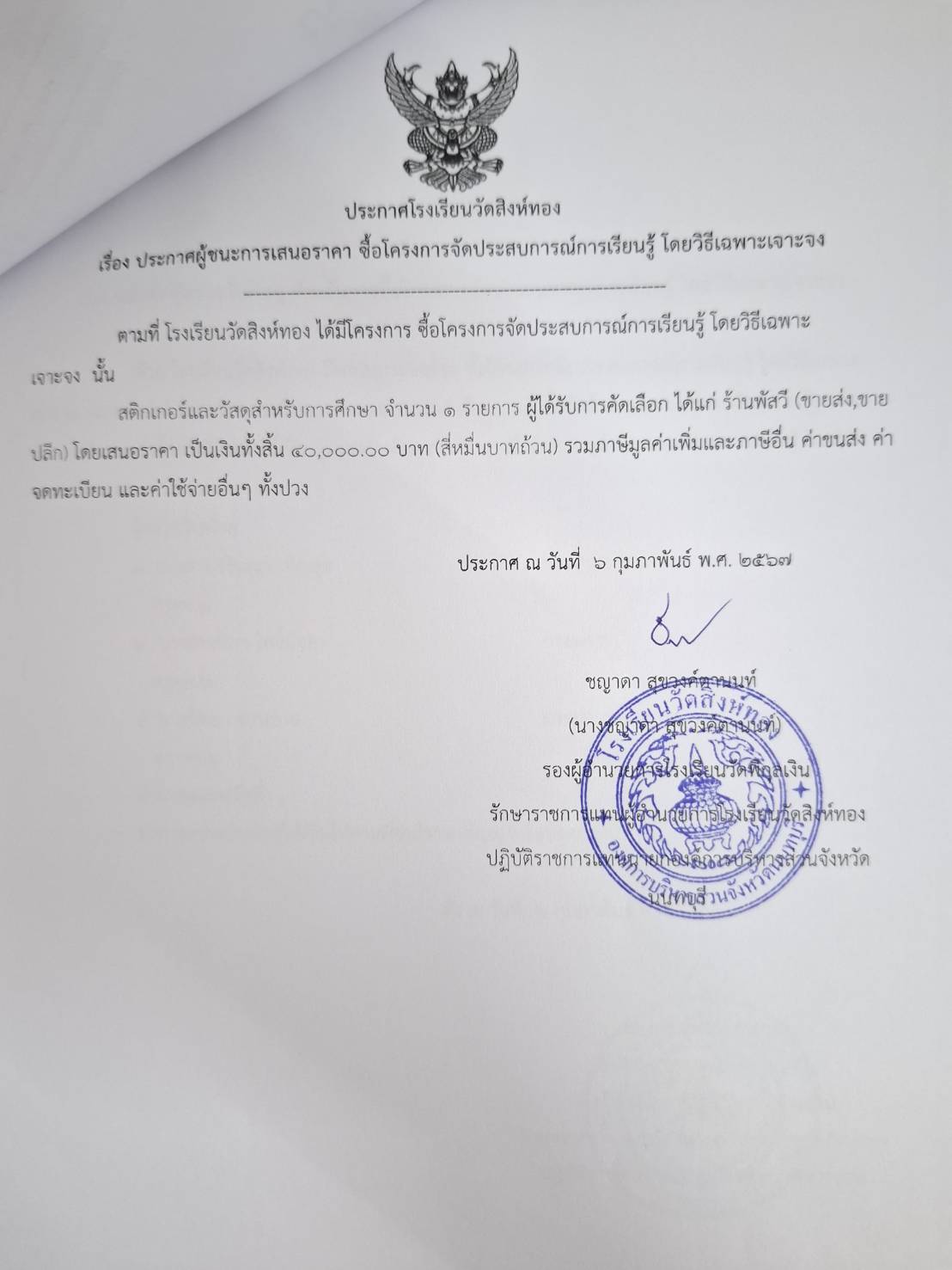 ประกาศเผยแพร่สาระสำคัญในสัญญา (ใบสั่งซื้อ) เลขที่ 14/2567 ลงวันที่ 6 กุมภาพันธ์ 2567 จัดซื้อวัสดุการเรียนการสอน โครงการจัดประสบการณ์การเรียนรู้