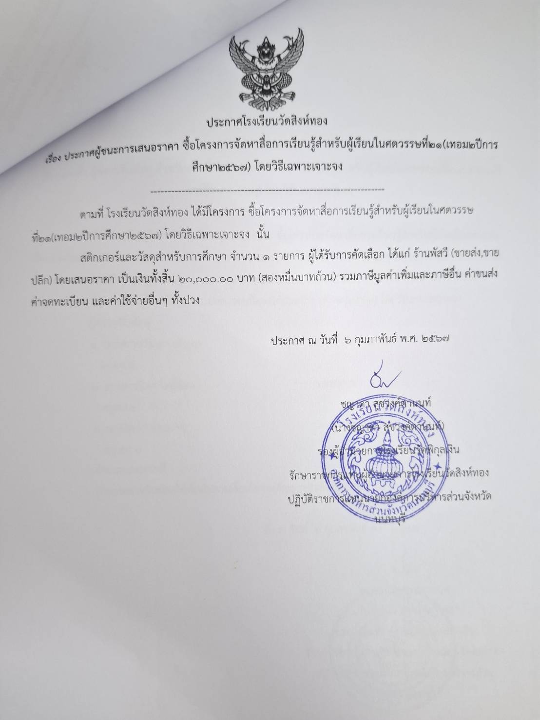 ประกาศเผยแพร่สาระสำคัญในสัญญา (ใบสั่งซื้อ) เลขที่ 15/2567 ลงวันที่ 7 กุมภาพันธ์ 2567 จัดซื้อวัสดุการเรียนการสอน โครงการจัดหาสื่อการเรียนรู้สำหรับผู้เรียนในศตวรรษที่21