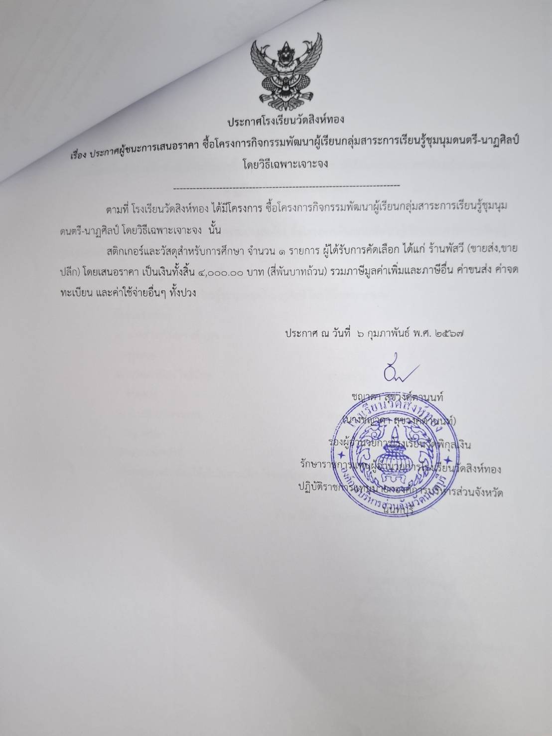 ประกาศเผยแพร่สาระสำคัญในสัญญา (ใบสั่งซื้อ) เลขที่ 16/2567 ลงวันที่ 7 กุมภาพันธ์ 2567 จัดซื้อวัสดุการเรียนการสอน โครงการกิจกรรมพัฒนาผู้เรียนกลุ่มสาระการเรียนรู้ชุมนุมดนตรี-นาฏศิลป์