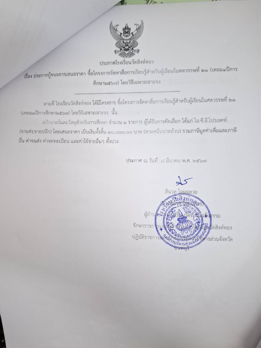 ประกาศเผยแพร่สาระสำคัญในสัญญา (ใบสั่งซื้อ) เลขที่ 18/2567 ลงวันที่ 20 มีนาคม 2567 จัดซื้อวัสดุการเรียนการสอน ตามโครงการจัดหาสื่อการเรียนรู้สำหรับผู้เรียนในศตวรรษที่21