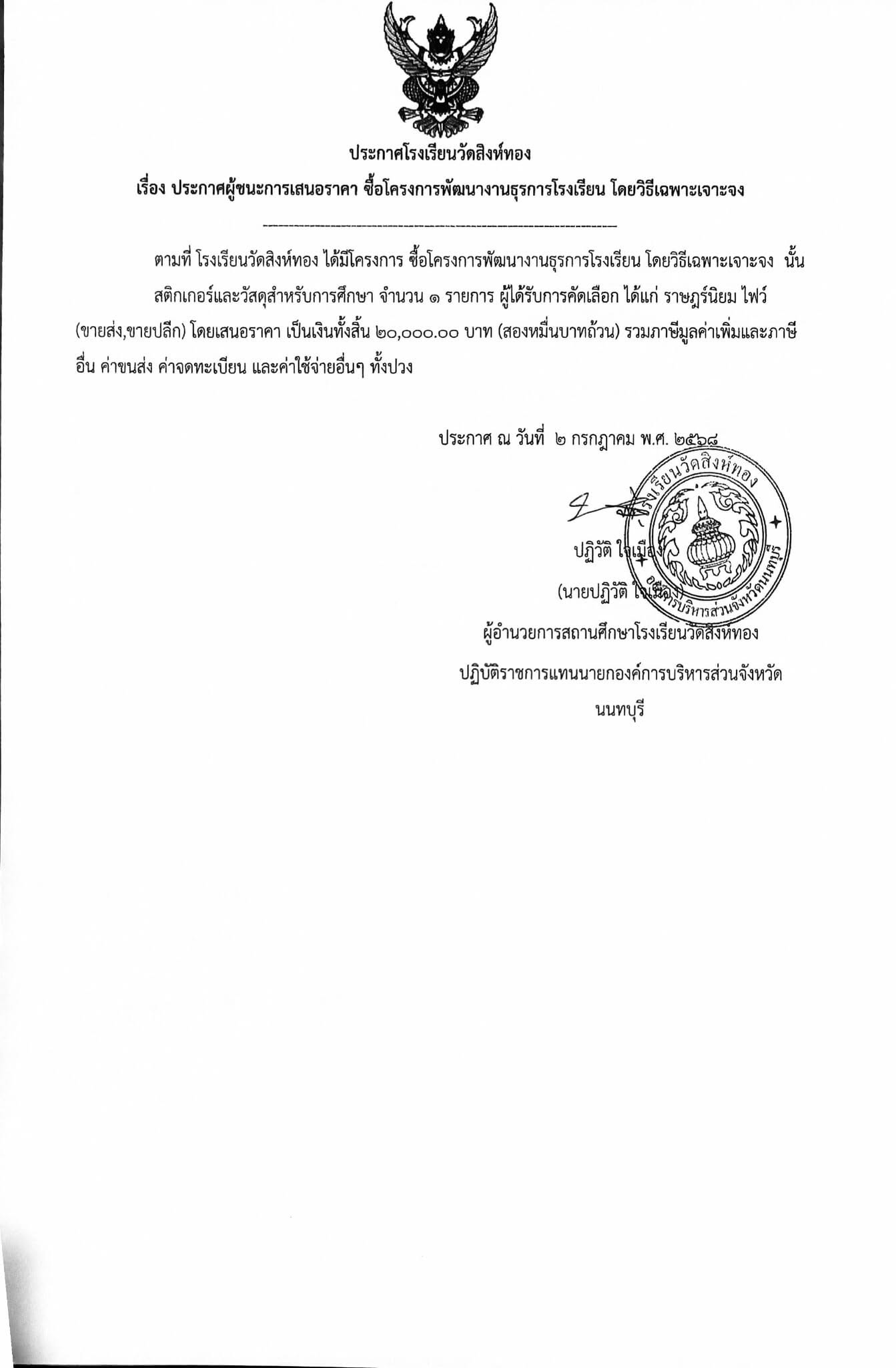 ประกาศผู้ชนะการเสนอราคา ซื้อโครงการพัฒนางานธุรการโรงเรียน โดยวิธีเฉพาะเจาะจง
