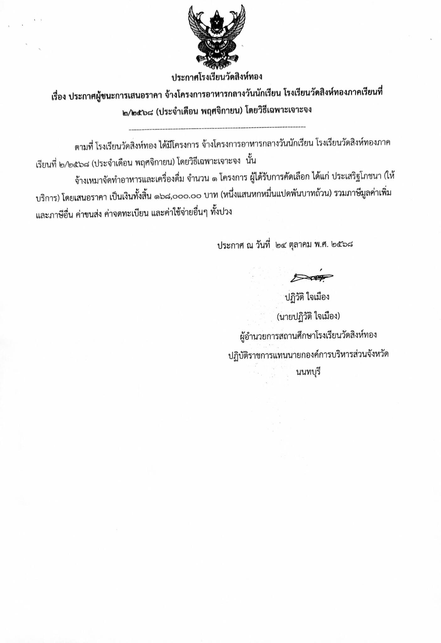 ประกาศผู้ชนะการเสนอราคา จ้างโครงการอาหารกลางวันนักเรียน โรงเรียนวัดสิงห์ทองภาคเรียนที่ ๒/๒๕๖๘ (ประจำเดือน พฤศจิกายน) โดยวิธีเฉพาะเจาะจง