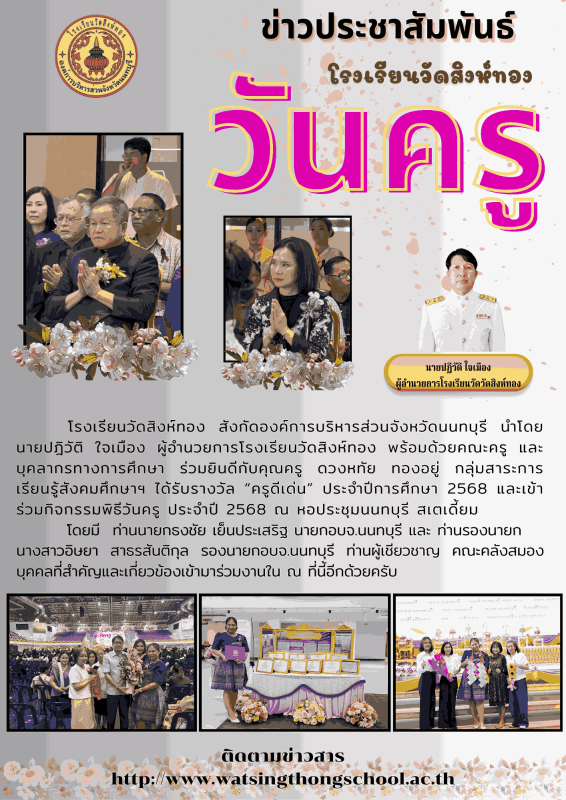 โรงเรียนวัดสิงห์ทอง Watsingthongschool โรงเรียนแห่งการพัฒนาในยุค 4.0 ยินดีต้อนรับเข้าสู่เว็บไซต์ โรงเรียนวัดสิงห์ทอง สังกัดองค์การบริหารส่วนจังหวัดนนทบุรี ค่ะ